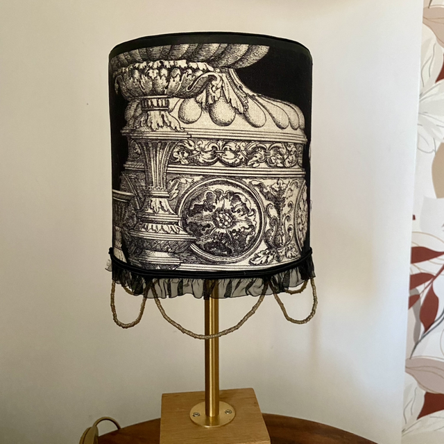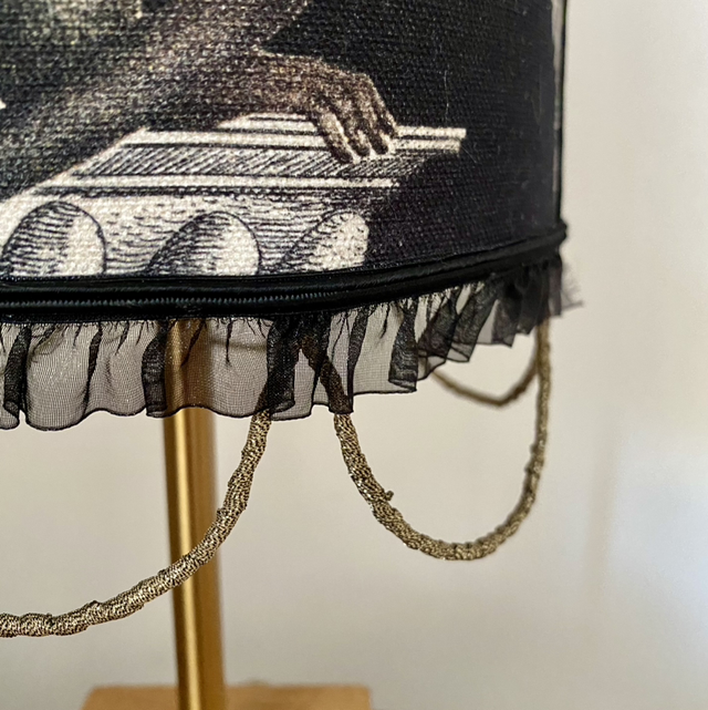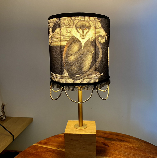 Lampe à poser BARROQUE, abat-jour en tissu épais motif noir et blanc avec juste une note coloré émanant du singe.